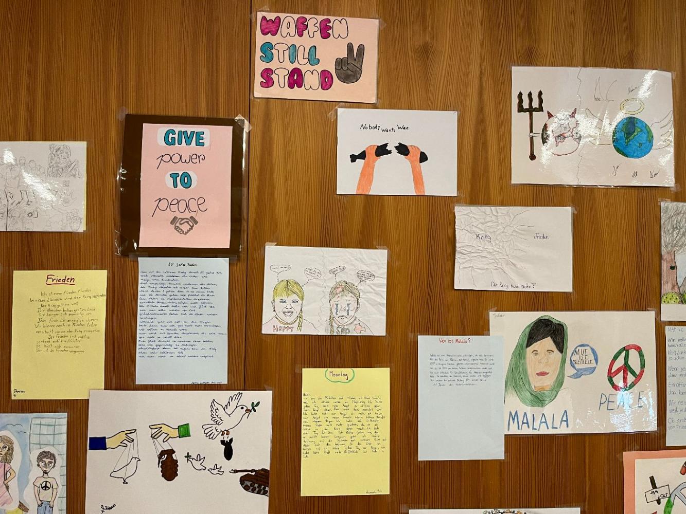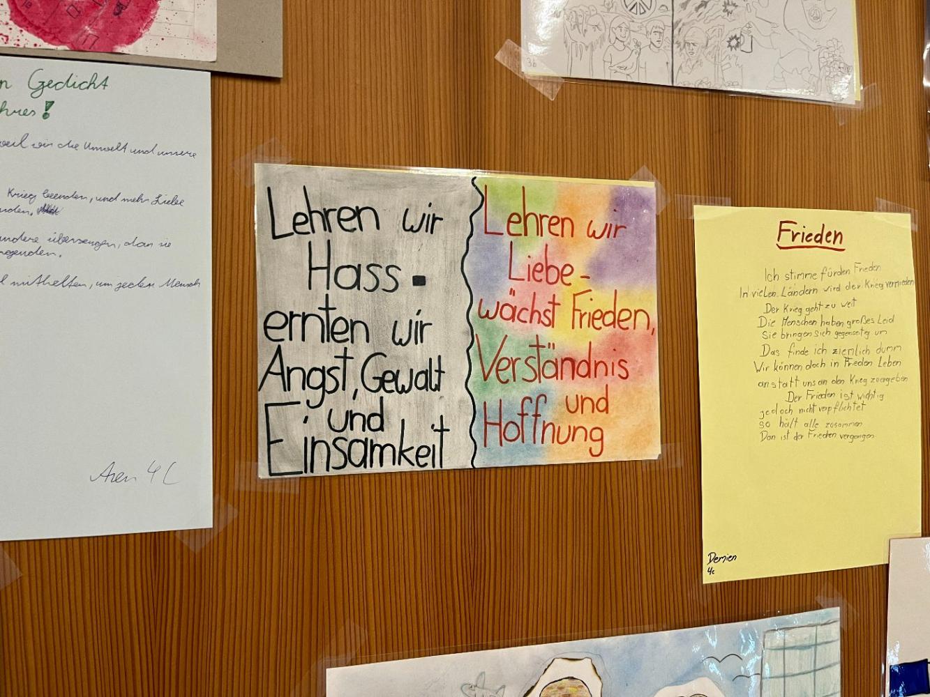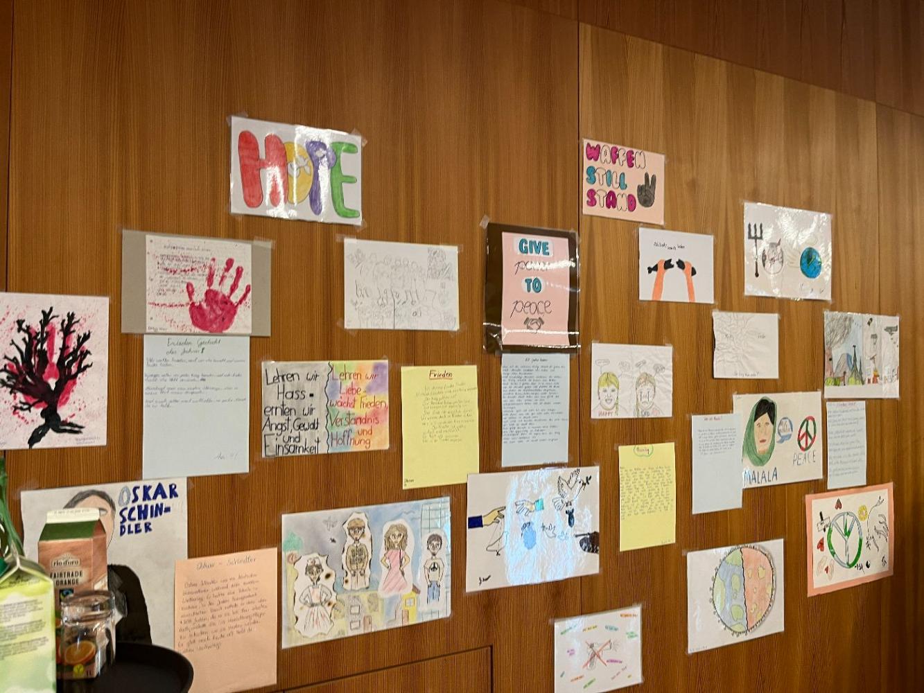 Im Anschluss wurden die Kinder in das Veranstaltungszentrum eingeladen, wo ein gemeinsames Essen stattfand. Zudem konnten sie dort ihre eigenen kreativen Arbeiten zum Thema "Krieg und Frieden" im Rahmen einer Ausstellung bewundern und stolz präsentieren.